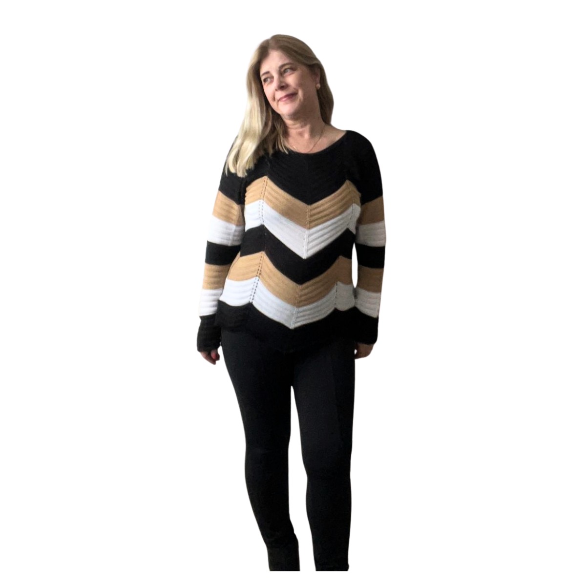Um toque moderno com conforto garantido! A Blusa Tricolor de Fio combina as cores preta, bege e branca em um design elegante e versátil, perfeito para compor looks estilosos em dias mais frescos. Com mangas compridas e modelagem soltinha, ela oferece um ótimo caimento e liberdade de movimentos.