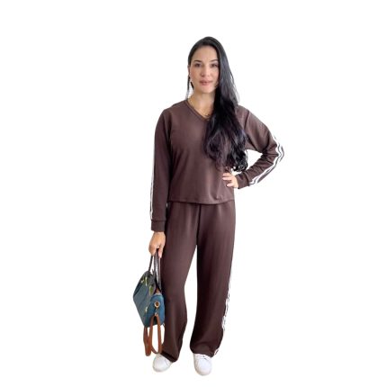 CONJUNTO BLUSA DECOTE V MANGA LONGA E CALÇA COM LISTRAS