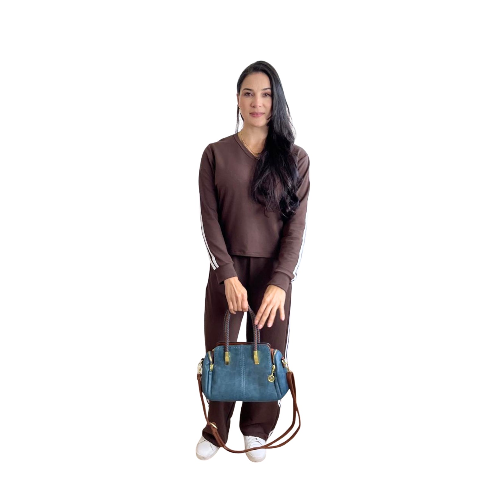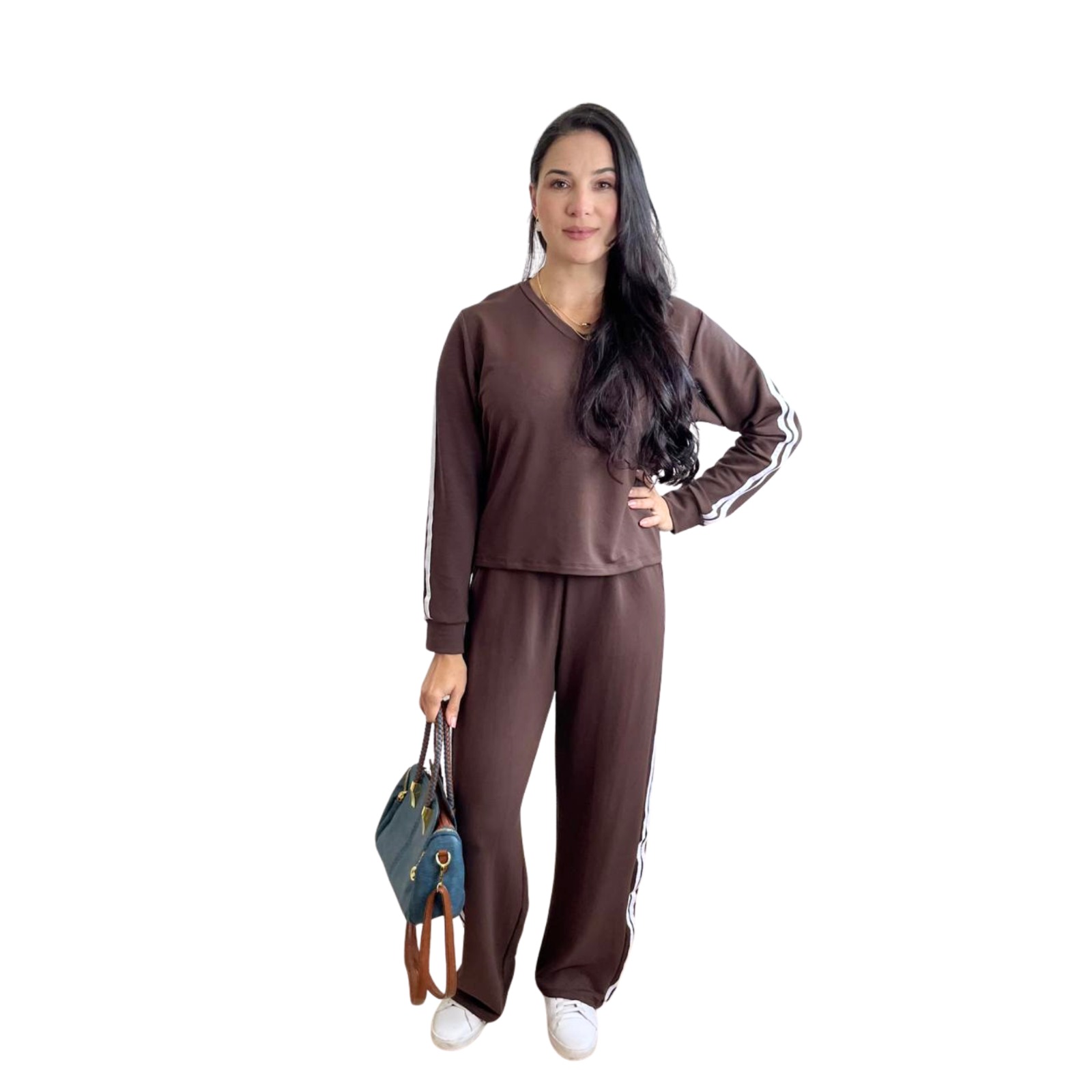 Conjunto Blusa Manga Longa e Calça com Listras – Marrom