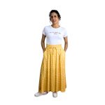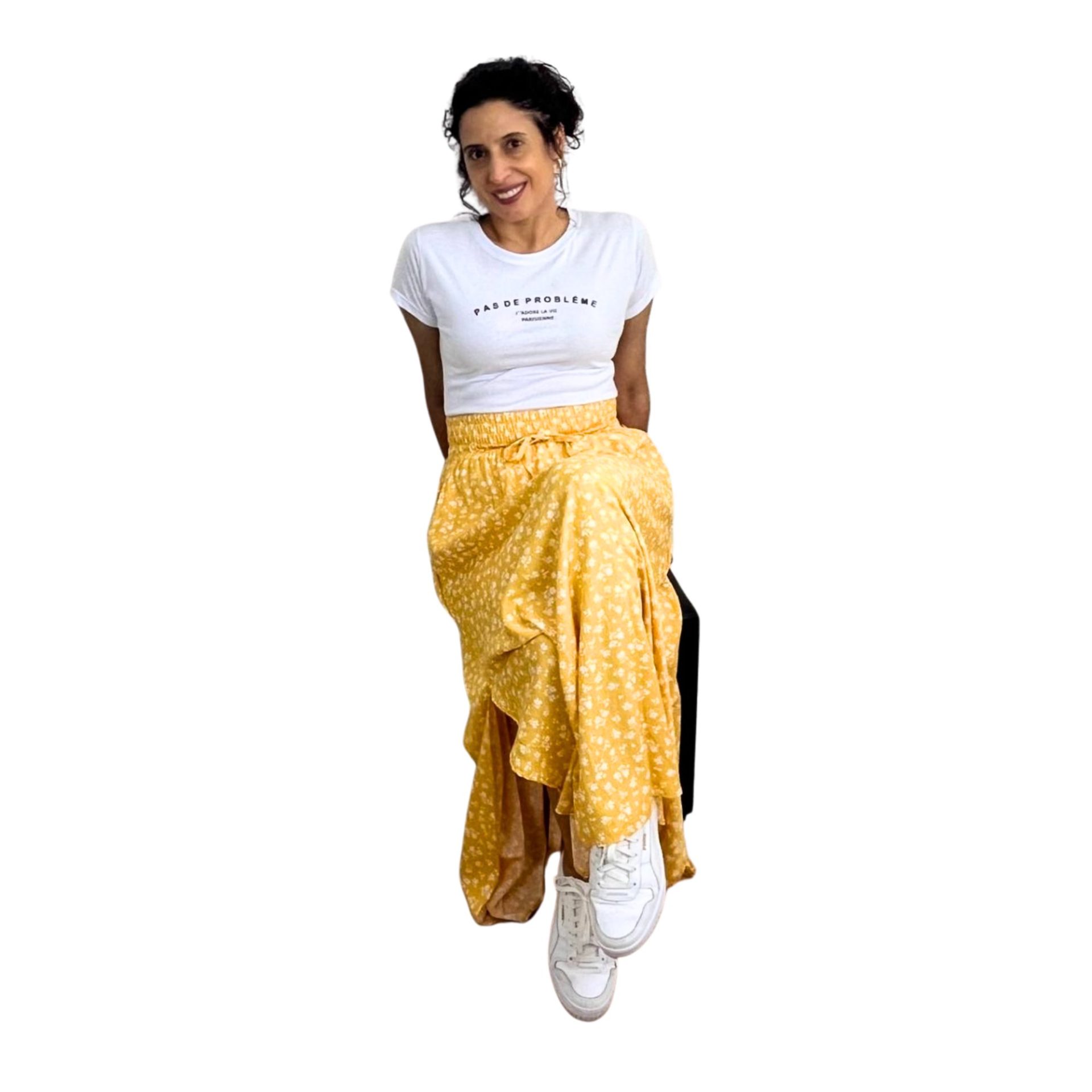 Esta saia longa é o equilíbrio perfeito entre conforto e estilo. Feita em viscose, um tecido leve e respirável, ela é ideal para os dias quentes. Com bolsos funcionais e aberturas laterais, proporciona praticidade e liberdade de movimento. A estampa amarela com flores brancas traz um toque de feminilidade e alegria ao look, perfeito para ocasiões casuais ou eventos ao ar livre.