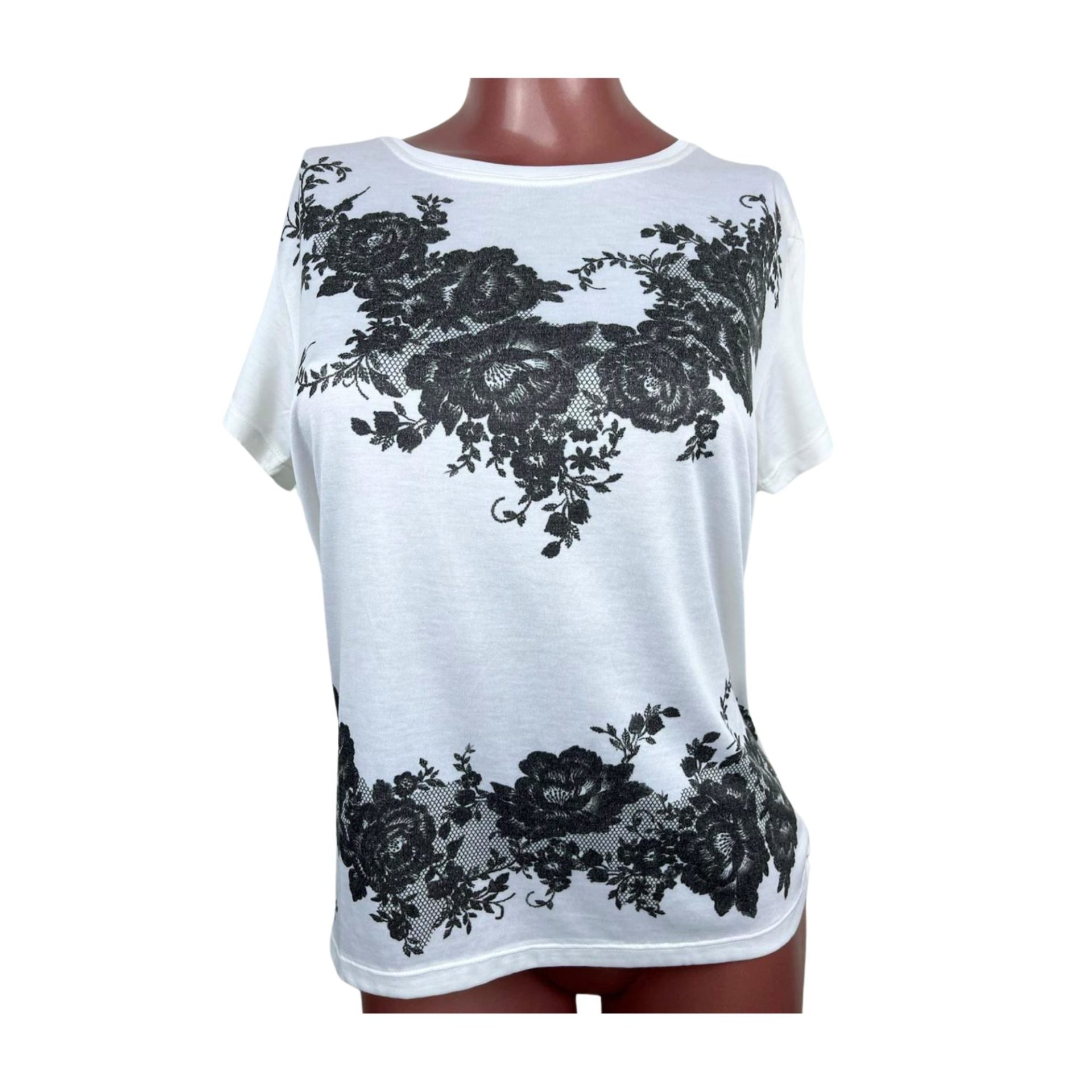 Confeccionada em um tecido leve e confortável, esta t-shirt é composta por viscose e poliéster, garantindo um caimento perfeito e um toque macio. O design branco com estampa de flor preta é elegante e versátil, ideal para compor looks casuais ou sofisticados.