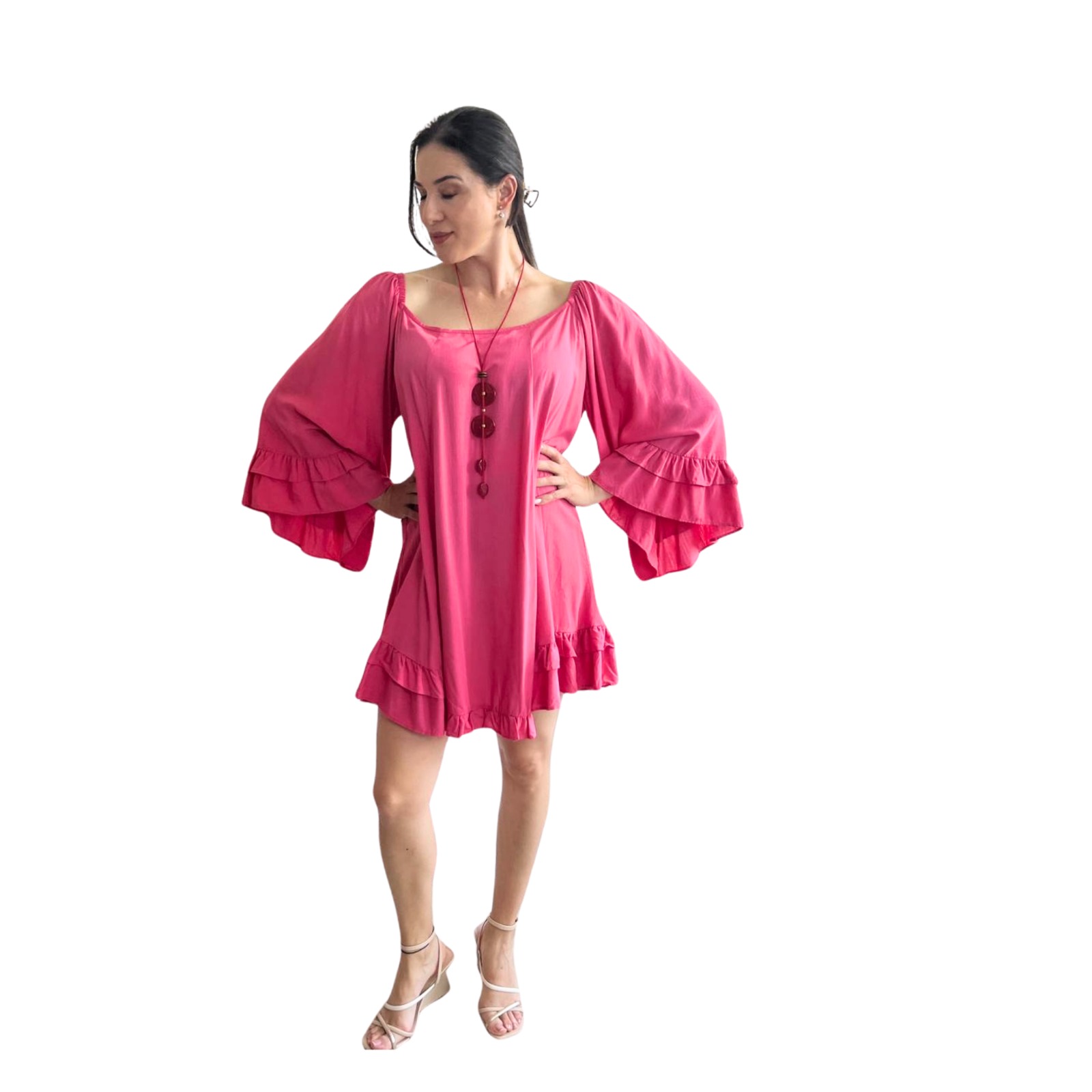 Em até 5x de R$37.98 sem juros À vistaR$170.91no Pix Leveza e sofisticação para qualquer ocasião! O vestido bata é confeccionado em viscose, garantindo um toque macio e conforto para o dia a dia. Na cor rosa, despojado e com um look muito feminino.