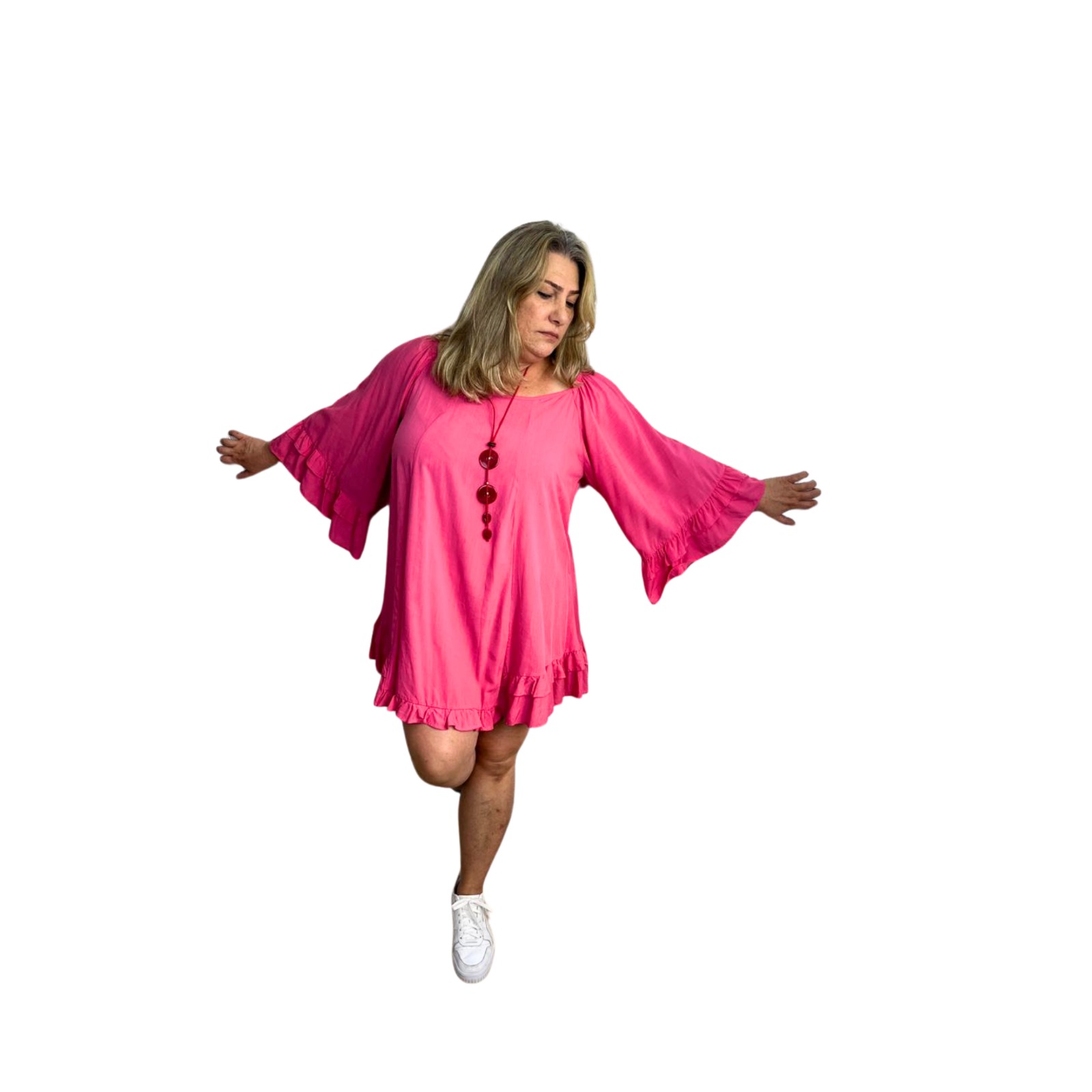Leveza e sofisticação para qualquer ocasião! O vestido bata é confeccionado em viscose, garantindo um toque macio e conforto para o dia a dia. Na cor rosa, despojado e com um look muito feminino.