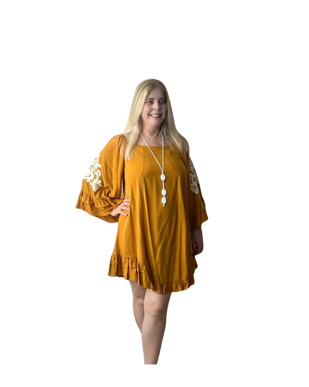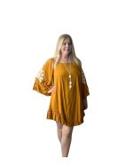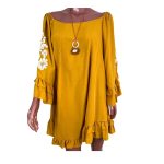 Leveza e sofisticação para qualquer ocasião! O vestido bata é confeccionado em viscose, garantindo um toque macio e conforto para o dia a dia. Na cor mostarda, traz um charme vibrante, complementado por detalhes delicados de flores brancas nas mangas, que adicionam feminilidade ao look.