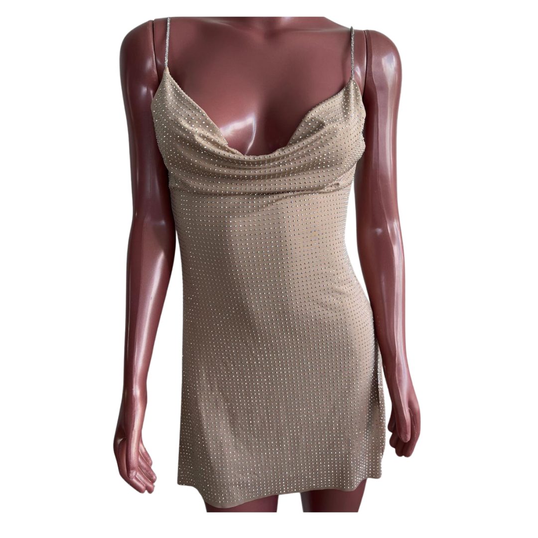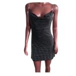 - Design: Decote drapeado que valoriza o busto e um corte curto para um visual moderno e glamoroso.