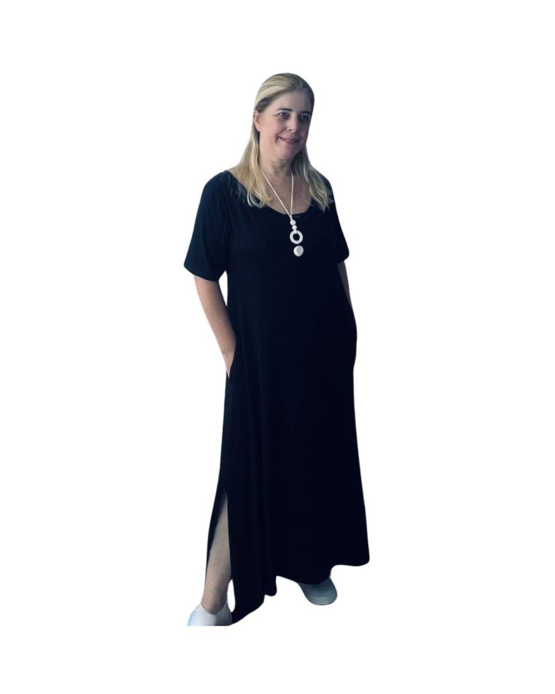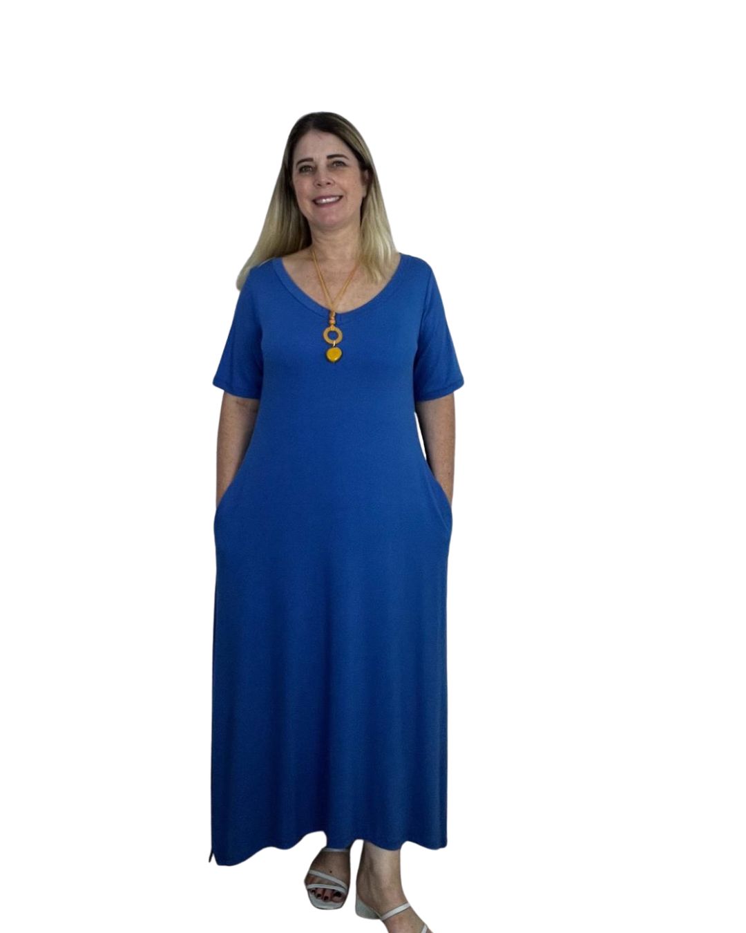 Em até 5x de R$23.98 sem juros À vistaR$107.91no Pix Vestido Longo Liso com Bolsos e Abertura Lateral